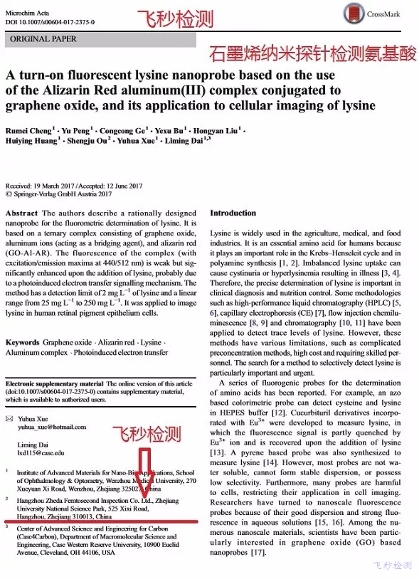 飛秒檢測銳意進(jìn)取,發(fā)現(xiàn)采用石墨烯-鋁-茜素紅構(gòu)成的納米材料,具有飛秒級別的熒光特征,可以選擇性識別水、溶劑、甚至細(xì)胞中的賴氨酸。該項研究成果對未知物檢測、配方分析、配方還原和研發(fā)、工業(yè)診斷、以及疾病診斷有巨大的意義。成果已經(jīng)發(fā)表在國際著名的SCI雜志Microchimica Acta上。
